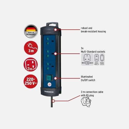 - 3 Multi-Standard Sockets: Compatible with British Standard (BS 1363), U.S. NEMA 1-15, and Euro CEE 7/16 plugs.