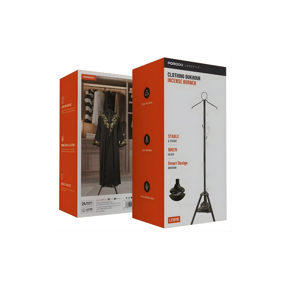 Porodo Lifestyle Clothing Bukhour Incense Burner is a unique and multipurpose accessory that can decorate your place with age-old incense and even deodorize apparel. Being in the shape of a hanger hook, it allows you to hang garments at ease while loading them with the sweet scent of bukhour. The sturdy and supportive tripod base guarantees security for use anywhere. Fitted with incense air holes, it effectively diffuses fragrance while avoiding overheating. Its convenient and safe application makes it perfect for domestic and traveling, providing ultimate wrinkle removal and perfuming synergy for your garments. At a height of 186CM, it has a lot of room to take various types of clothing, making it the perfect addition for those who love style and culture.