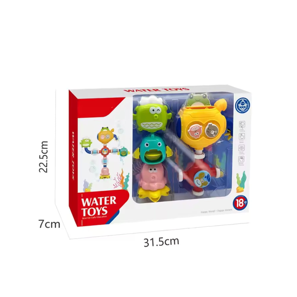 This set includes multiple stackable components, featuring cute monster-like characters and a larger piece with a pouring or spinning function. They are ideal for encouraging hand-eye coordination, fine motor skills, and creative play during water activities. The bright colors and distinct shapes are designed to capture a child's attention, making learning an enjoyable experience.